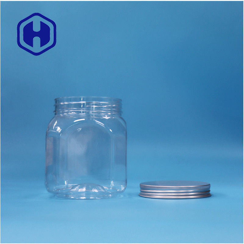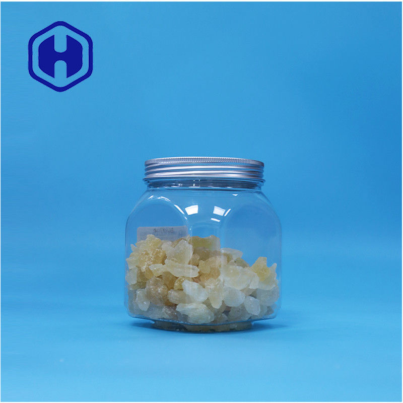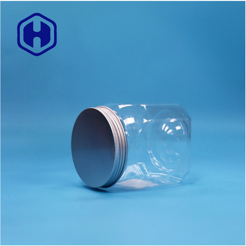 बहुभुज आकार का स्पष्ट प्लास्टिक कुकीज़ रॉक कैंडी नट्स चीनी जार एल्यूमीनियम शीर्ष ढक्कन