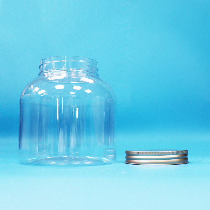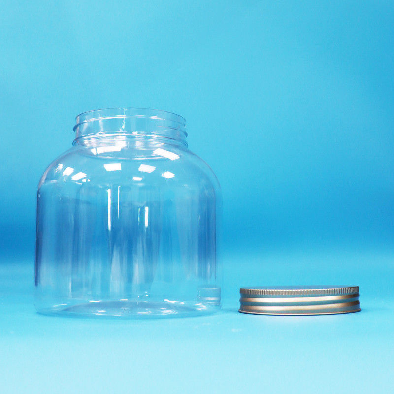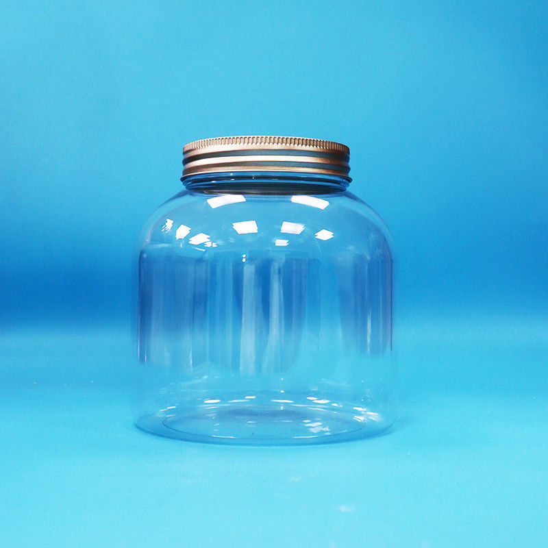 एल्यूमीनियम पेंच ढक्कन के साथ पारदर्शी प्लास्टिक पीईटी गोल कैंडी दैनिक खाद्य जार