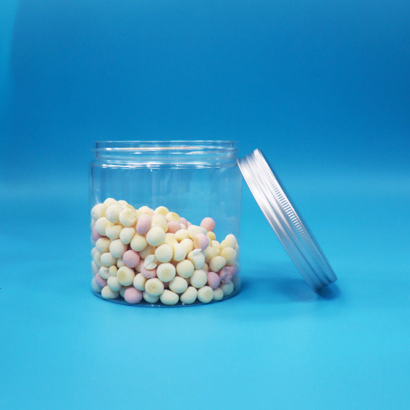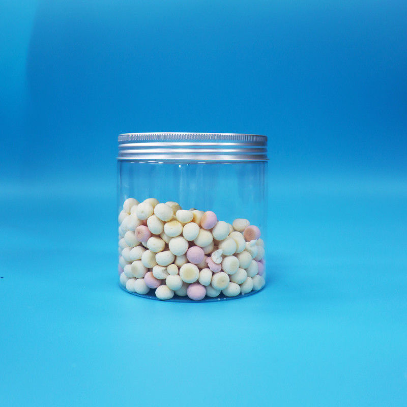 गोल चौड़ा मुंह सिलेंडर के आकार स्पष्ट पीईटी प्लास्टिक कुकीज जार एल्यूमीनियम पेंच टोपी