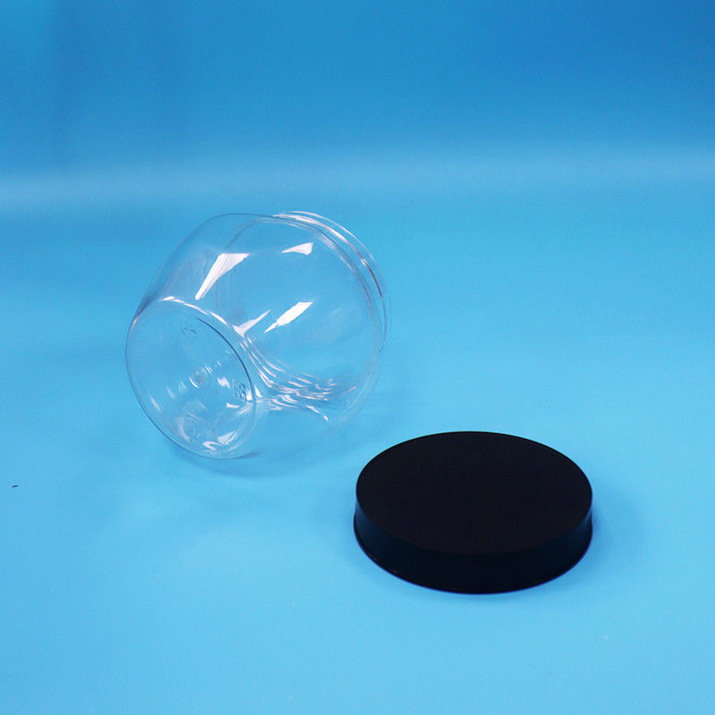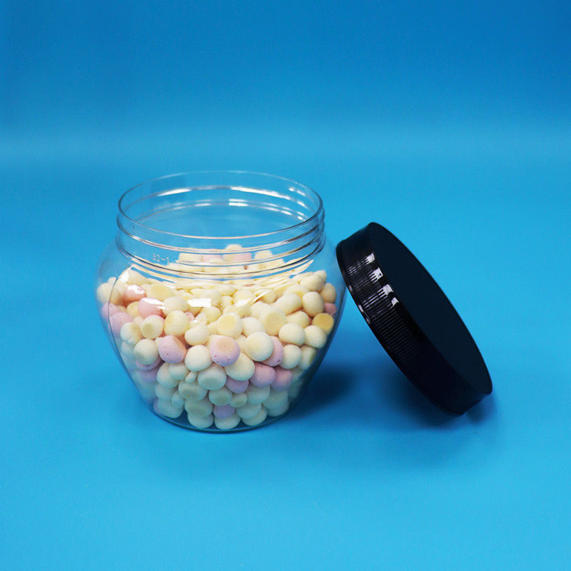 सील पारदर्शी अद्वितीय आकार प्लास्टिक पीईटी कैंडी खाद्य कुकी जार काले प्लास्टिक ढक्कन