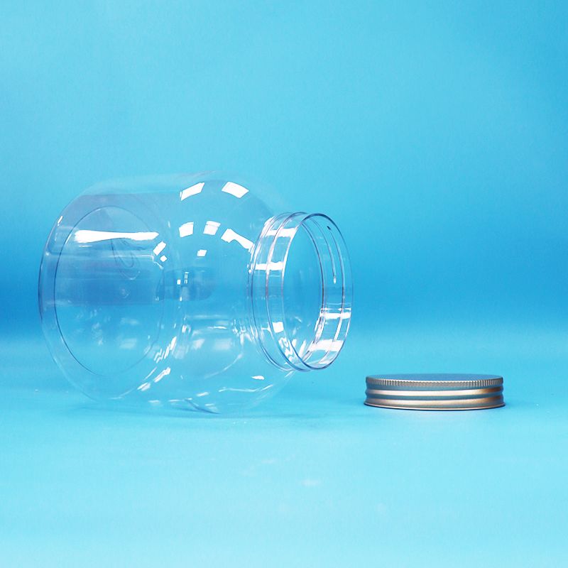 पर्यावरण के अनुकूल पारदर्शी प्लास्टिक पीईटी गोल कैंडी दैनिक खाद्य जार एल्यूमीनियम पेंच ढक्कन